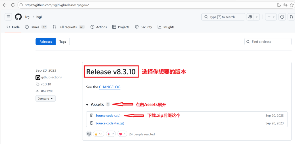 我们可以直接前往lvgl的github的release界面:https://github.com/lvgl/lvgl/releases?,找到你所需要的版本,我这里就用8.3.10版本做演示。选择你需要的版本,展开Assets,单击下载.zip后缀的即可。