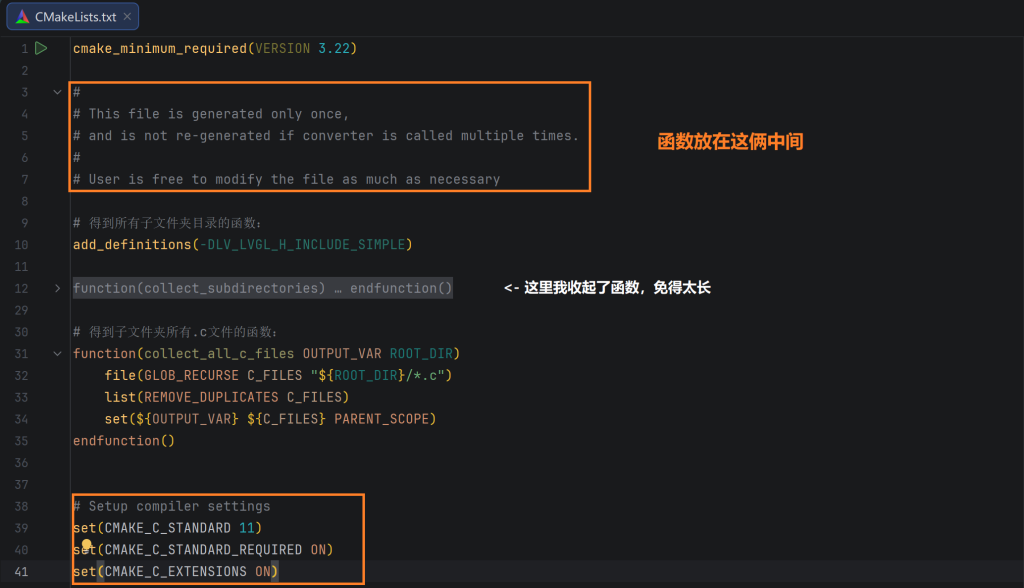 复制下面的两个代码函数到CMakeLists.txt的 ”开头注释“ 的下方,“Setup compiler settings”上方: