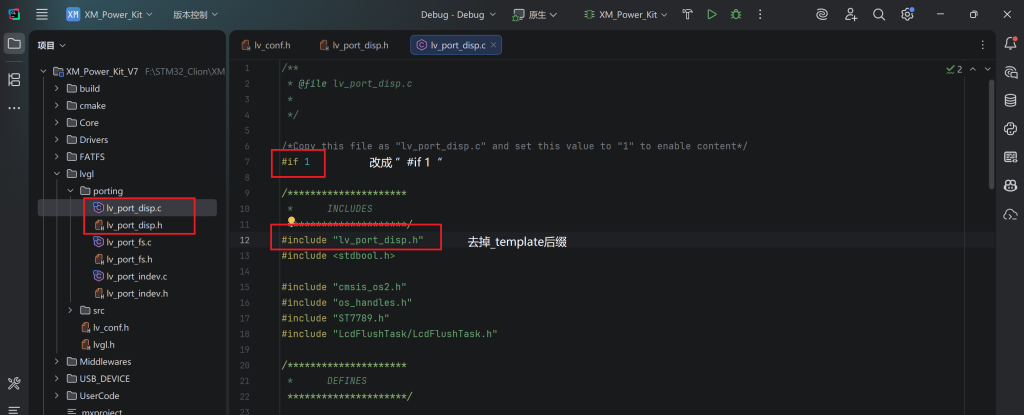 3. 我们打开porting文件夹,去掉其中6个文件的文件名末尾的“_template”字样,当然别忘了lvgl\lv_conf_template.h这个文件也要改: