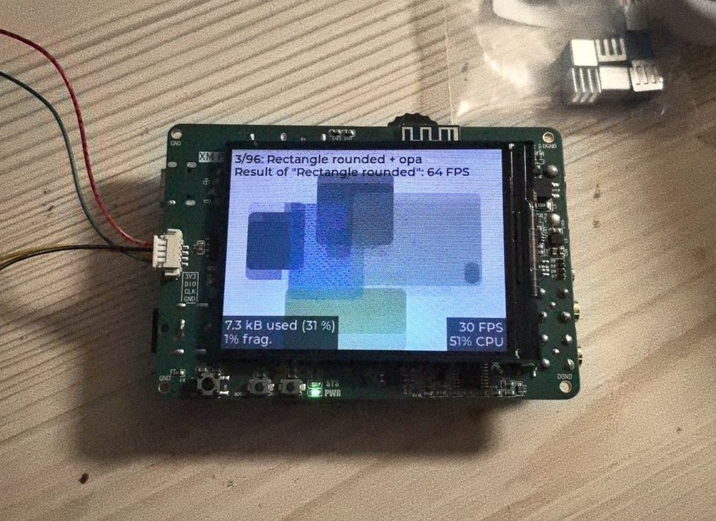 我们来跑一个benchmark例程吧,顺便开启一下lvgl的性能监视器(显示内存占用,帧率之类的数据)
