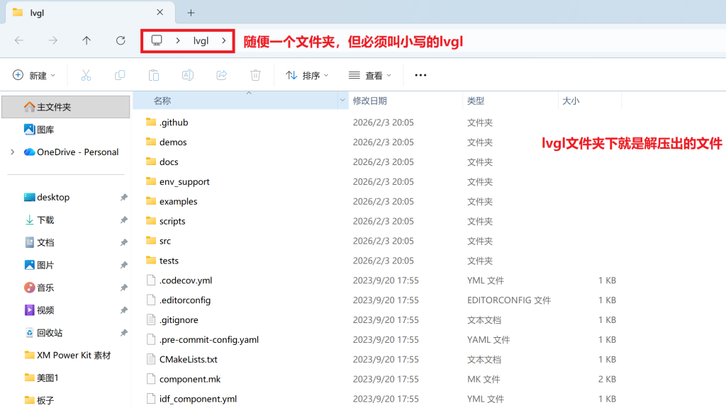 1. 我们将刚刚下载的压缩包解压到随便一个文件夹中,并将文件夹的名称命名为“lvgl”(很重要,不要改这个名字)