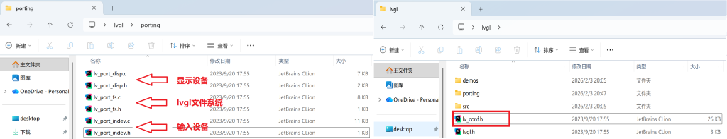 其中,porting文件夹在lvgl\examples\下,我们将它拷贝到lvgl\下,再删去examples文件夹即可。