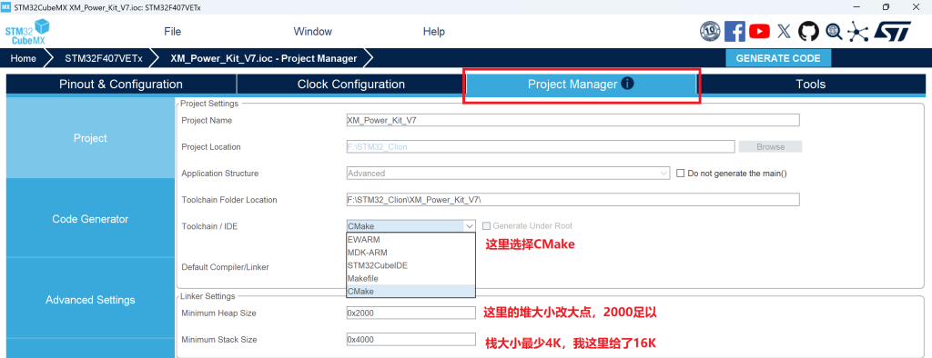 然后点击右上角的”GENERATE CODE“按钮,CubeMX就自动帮我们生成好了代码~