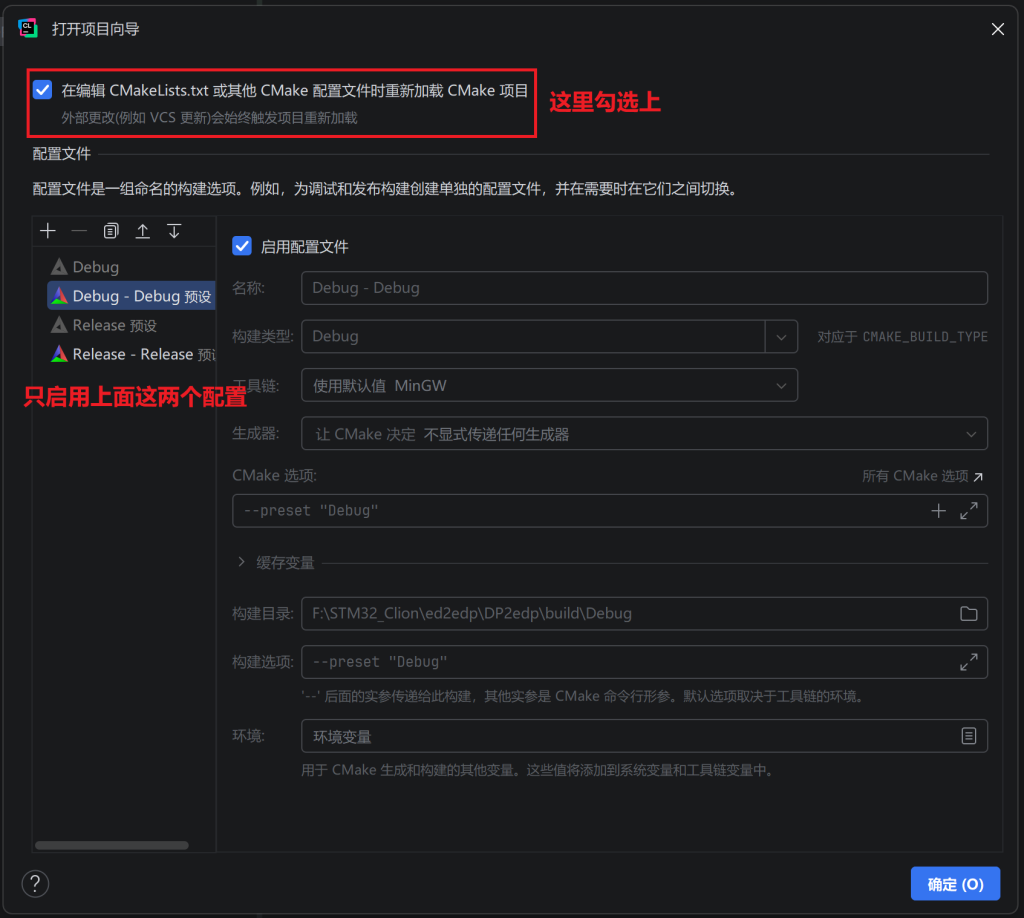 - 勾选“在编辑CMakeLists.txt时……”的选项框